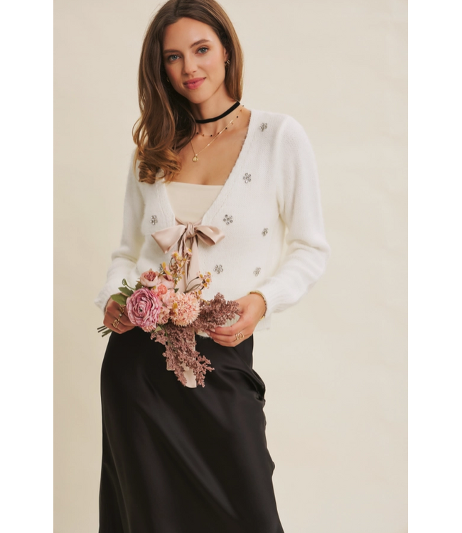 This embellished knit cardigan brings a touch of sparkle to an otherwise timeless essential. Crafted in a soft ivory knit, it features delicate crystal accents scattered throughout for subtle shine without feeling overdone. Designed to layer easily over tanks, blouses, or dresses, it transitions seamlessly from daytime polish to evening charm.
