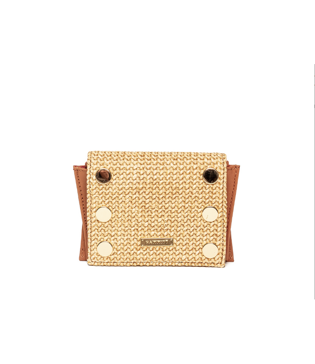 Crafted from chaparral raffia with medium tone tan brown pebbled leather and mosaic brown pebbled leather accents, this wallet blends natural texture with refined details. Signature front rivets, shiny gold hardware, and Hammitt’s signature red cotton twill lining complete the design.
