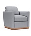 The Allie swivel chair is roomy and super comfortable which makes it an in-store favorite! Shown and in store in this light blue and ivory pinstripe. The bottom is a medium toned Latte wood fin