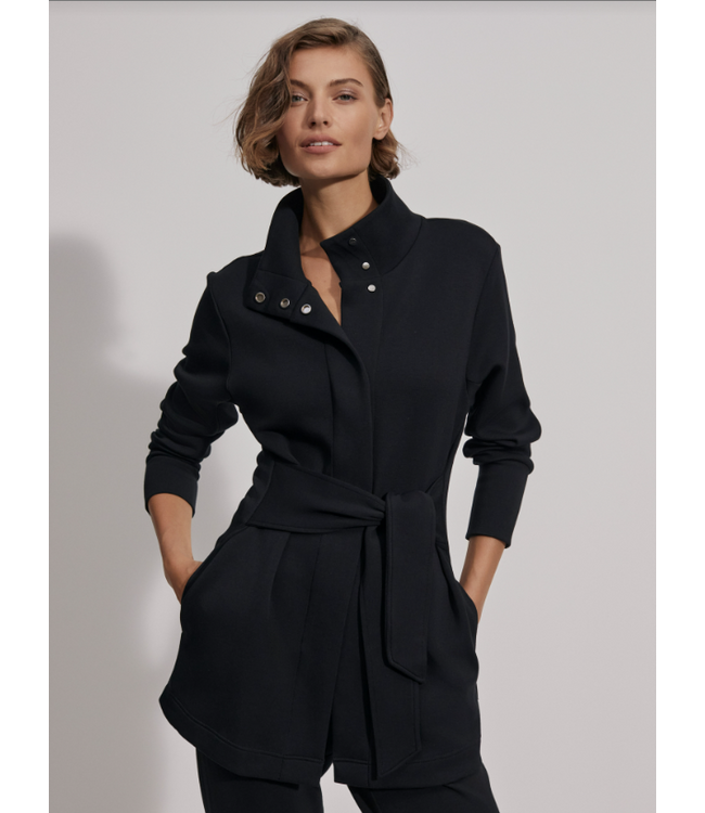 Chic black belted jacket with a modern stand collar and sleek tailored shape—an elevated layering piece that instantly polishes any look.
