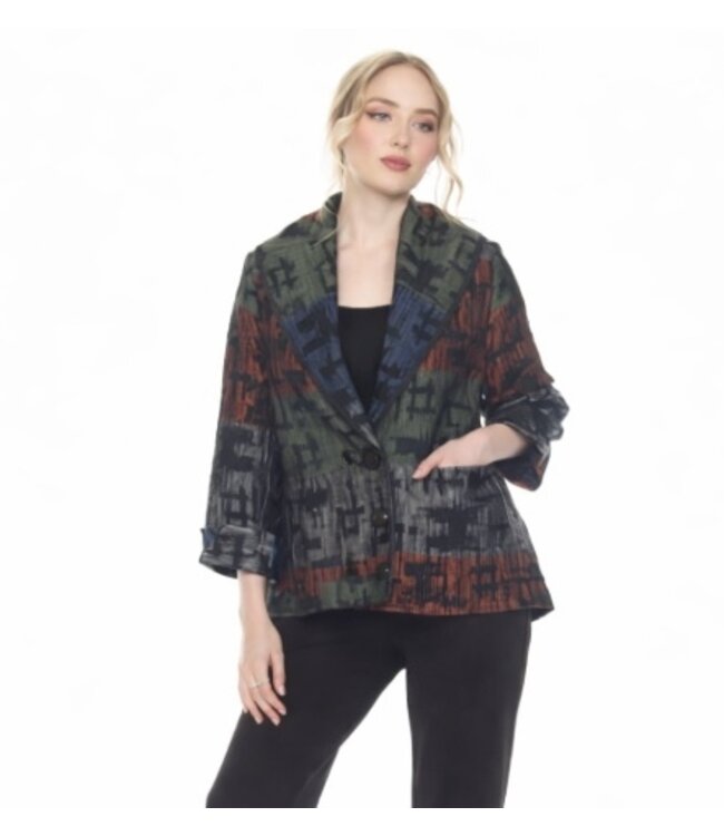 This Button Front Jacket in Rust, Blue, and Green blends artistic pattern with effortless sophistication. Designed with a flattering, softly structured silhouette, it features a classic button-front closure and a beautifully layered color palette that adds depth without overwhelming. The lightweight construction makes it ideal for transitional seasons, while the tailored shape allows for easy styling over tops, knits, or dresses. Whether paired with trousers for a refined look or dressed down with denim, this jacket delivers boutique-level style with everyday versatility.
