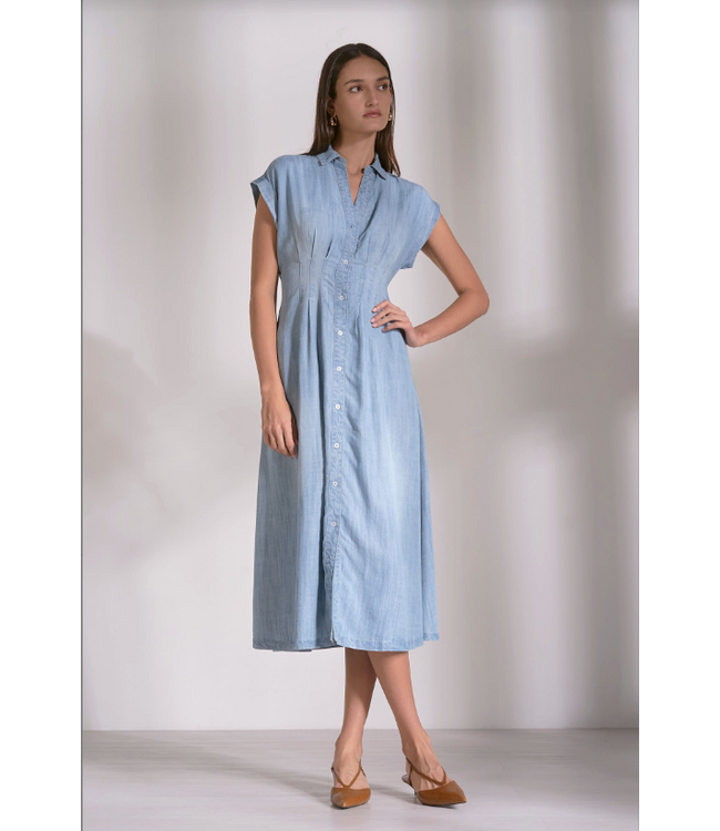 This chambray midi dress offers classic style with an easy, modern feel. Designed with a button-front closure and gentle shaping through the waist, it creates a flattering silhouette without feeling restrictive. The lightweight chambray fabric keeps it breathable and comfortable, making it perfect for workdays, weekends, or casual outings.