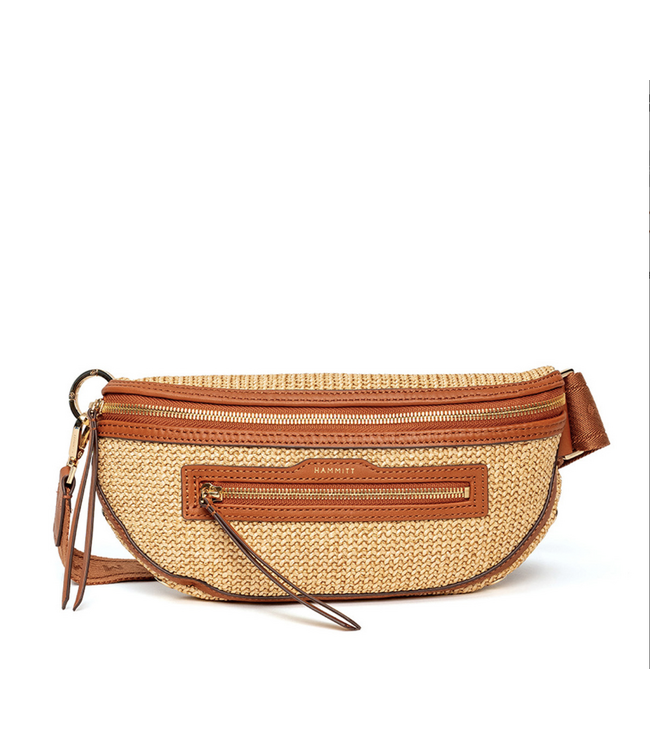Crafted from a beautiful combination of chaparral raffia, medium tone tan brown pebbled leather, and mosaic brown pebbled leather, the design blends natural texture with polished details. Shiny gold hardware and Hammitt’s signature red cotton twill lining complete the elevated look.