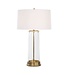 Appearing to float in a clear glass cylindric hurricane, a single light antique brass raindrop is held in a suspension by brass-finished clips. A taupe, braided fabric French cord exits the bottom of the raindrop. The transitional style works well in modern or traditional style rooms. A slightly tapered round hardback shade in an elegant white fabric completes the look.