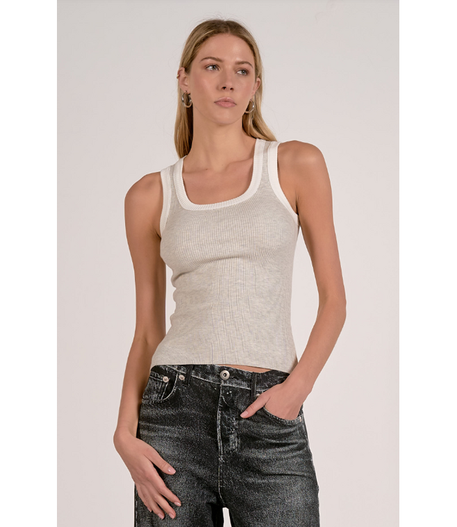 This ribbed tank is a timeless wardrobe staple with a polished twist. Crafted from a soft, stretchy ribbed knit, it features contrast trim that frames the neckline and armholes for a clean, modern look. The fitted silhouette makes it ideal for layering or wearing on its own with denim, trousers, or skirts.