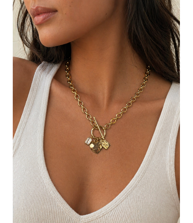 Striking and full of character, this L George charm necklace is designed to make an impact. The bold gold chain is paired with a sculptural toggle closure, creating a focal point that feels both modern and intentional. Finished with a mix of statement charms—including a polished heart and textured accents—it brings dimension and personality to every look.
