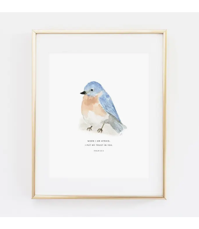 Bluebird watercolor illustration with Psalm 56:3: "When I am afraid, I put my trust in you."