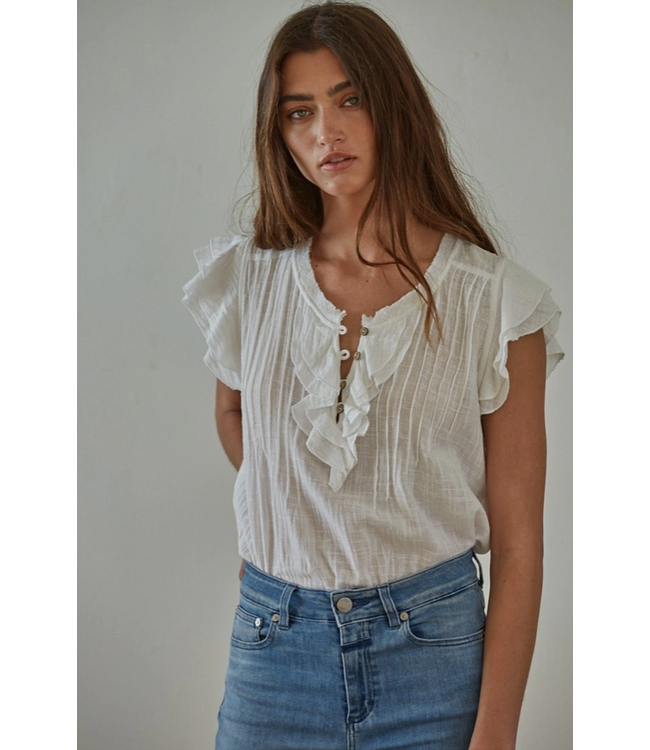 This softly textured white blouse blends feminine charm with effortless versatility. The subtle vertical texture, delicate ruffle detailing, and lightweight feel create a flattering silhouette that works beautifully from casual days to dressed-up moments. Easy, breathable, and timeless, it’s a wardrobe essential you’ll reach for often.