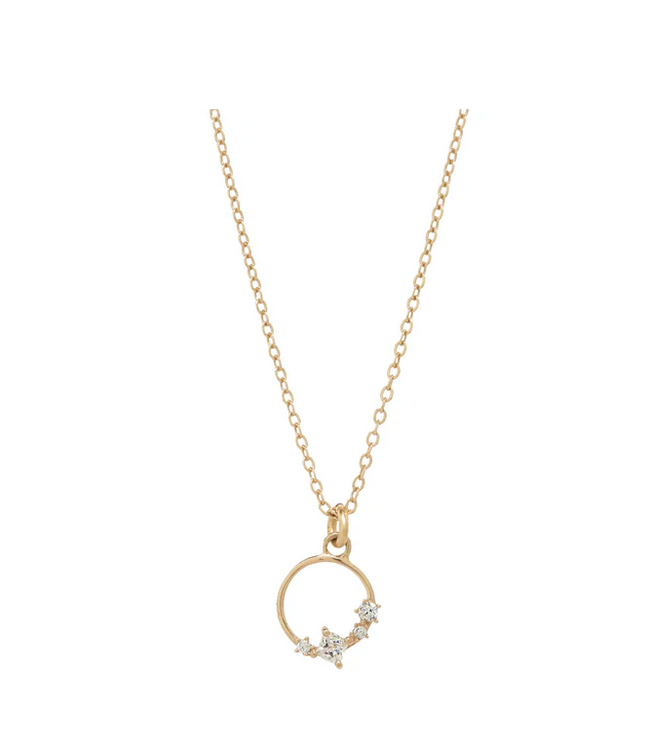 Sweet, simple, and beautifully refined, this wreath CZ necklace features a petite gold circle accented with shimmering cubic zirconia stones. The delicate wreath-inspired design adds a subtle sparkle that feels effortless for daily wear and elegant for special moments.