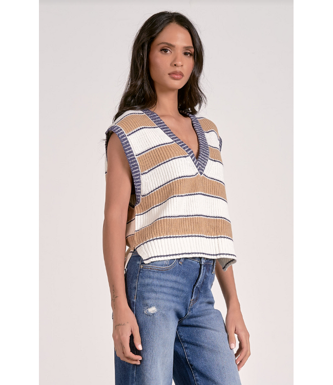 This striped sweater vest brings an easy, fashion-forward touch to everyday outfits. Designed with a relaxed silhouette and classic V-neckline, it layers beautifully over crisp shirts or simple tanks, while the warm neutral palette keeps it timeless and versatile.