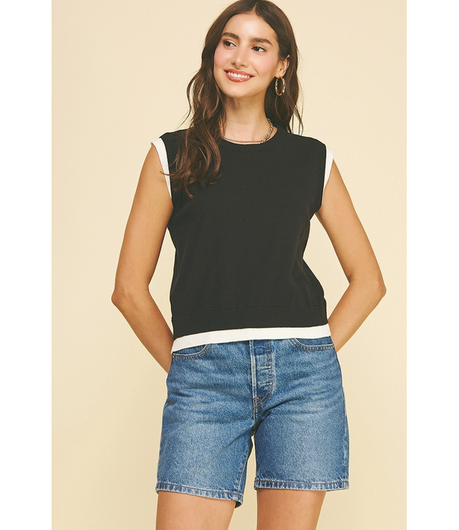 Sleek, simple, and quietly elevated, this black knit tank delivers effortless sophistication. The contrast trim adds subtle dimension while the structured knit silhouette keeps it polished without sacrificing comfort.