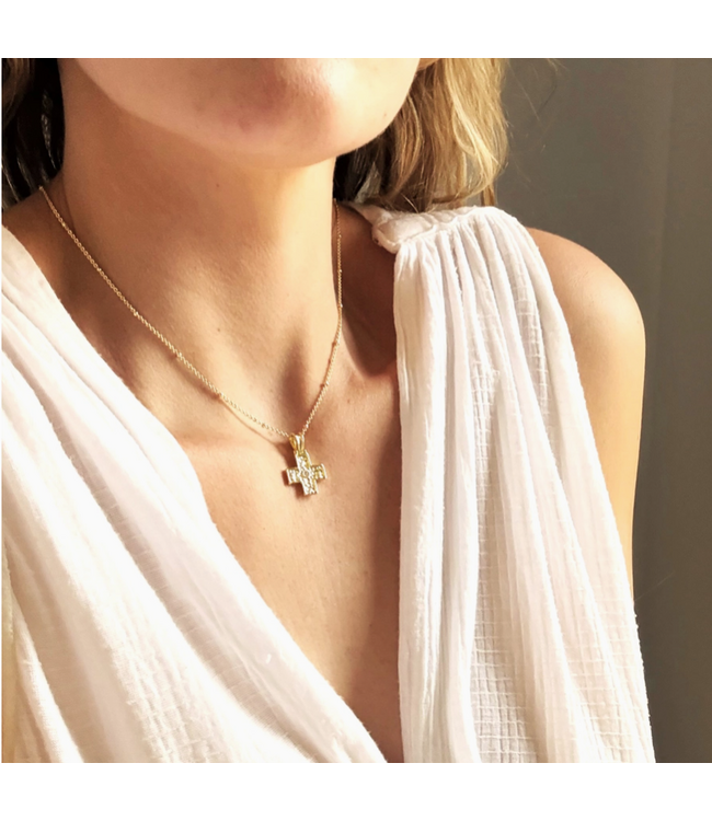 This refined pendant necklace blends timeless symbolism with modern elegance. The cross-inspired charm features subtle sparkle detailing that catches the light while maintaining a clean, understated feel. Suspended from a delicate chain, it offers effortless versatility — beautiful worn alone or layered with other favorites. Designed to be both meaningful and stylish, this piece transitions seamlessly from everyday wear to more polished occasions.