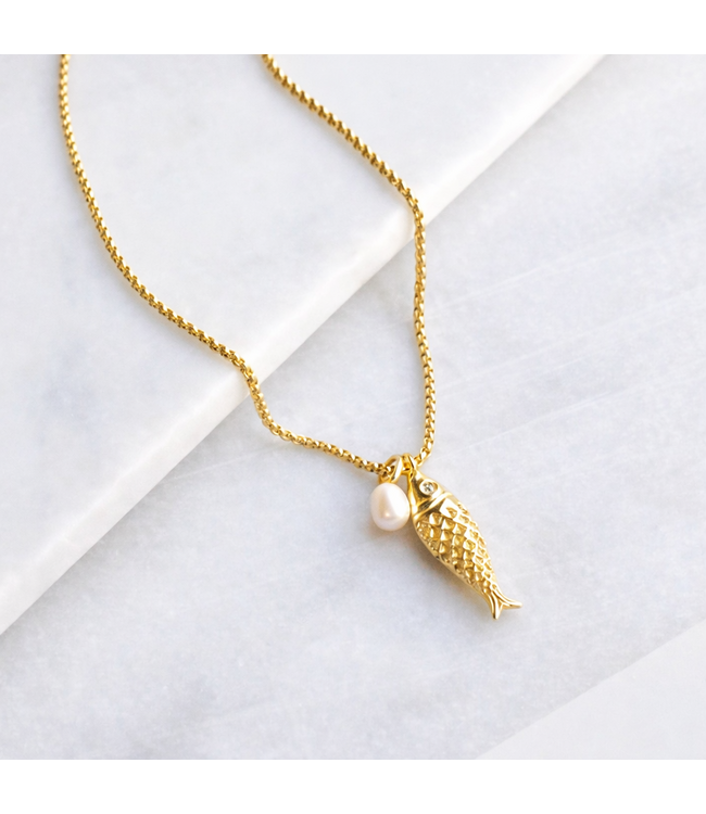 This elegant pendant necklace pairs a textured fish charm with a luminous pearl accent for a look that feels both playful and refined. The detailed charm adds dimension and character, while the pearl brings a soft, timeless touch. Suspended from a delicate gold chain, this piece layers beautifully with other favorites or stands alone as a subtle statement. Designed to balance charm and sophistication, it transitions effortlessly from casual styling to more polished moments.