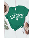 A festive “Happy Go Lucky” graphic tee in a bold emerald green, featuring a playful shamrock detail—an easy, feel-good favorite for casual days and seasonal celebrations.