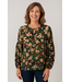Bring sophistication and charm to your wardrobe with this floral blouse by Emily Lovelock. Crafted in a lightweight, flowy fabric, this piece showcases a lively botanical print in shades of ivory, orange, green, and violet set against a rich, dark backdrop. The neckline is finished with a feminine ruffle trim and a tie-keyhole closure, adding just the right touch of romance and detail.