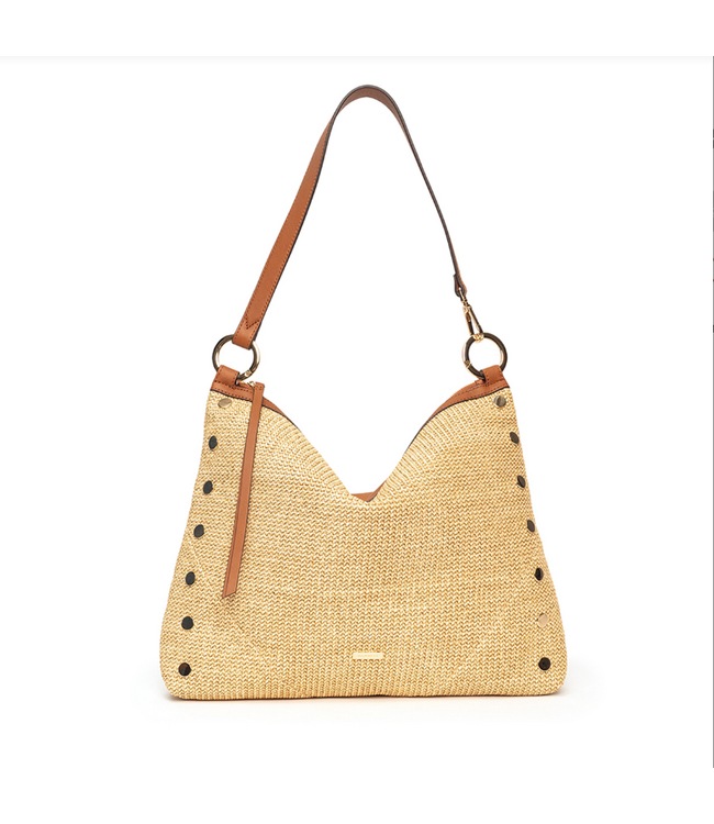 Crafted from beautifully woven chaparral raffia paired with medium tone tan brown pebbled leather and mosaic brown pebbled leather accents, this bag delivers a fresh seasonal look while maintaining the signature Hammitt aesthetic. Shiny gold hardware and the brand’s signature red cotton twill lining complete the design with refined detail.