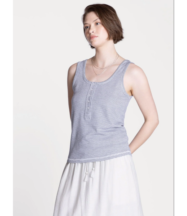Timeless and easy to wear, this navy stripe tank is a go-to essential for effortless everyday style. Designed with a flattering fit and soft, lightweight fabric, it offers comfort while maintaining a clean, polished look. The subtle stripe pattern adds a classic touch, while the button detail at the neckline brings just the right amount of interest.