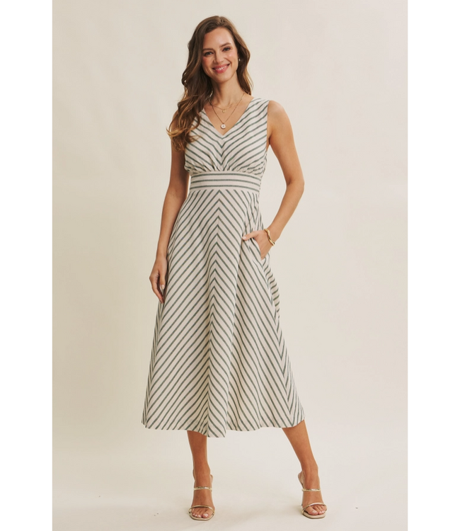 This striped midi dress combines timeless design with easy elegance. Featuring a V-neckline, softly defined waist, and fluid skirt, it creates a flattering silhouette without feeling structured. The subtle sage stripe adds visual interest while remaining neutral and versatile, making it perfect for daytime events, vacations, or casual evenings out.
