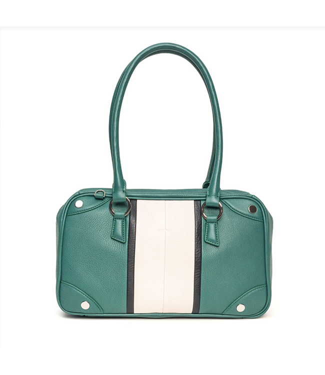 Crafted from rich green pebbled leather, the bag is accented with striking calla lily white paneling and classic black piping for a bold color-blocked look. Signature rivets and shiny silver hardware complete the distinctive Hammitt aesthetic.