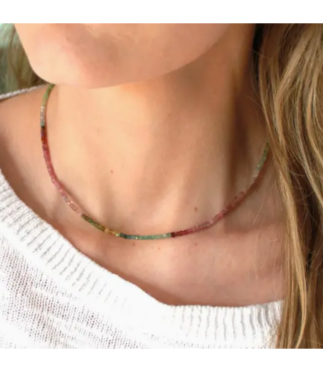 This handcrafted watermelon tourmaline necklace is effortlessly chic and full of natural beauty. Featuring genuine 3mm square tourmaline beads in soft shades of pink and green, it creates a delicate pop of color that feels both refined and wearable.
