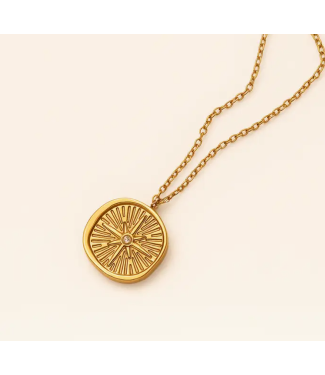 The North Star Necklace is a meaningful piece designed to guide and inspire. Featuring a beautifully engraved pendant with a radiant starburst pattern and a subtle center stone, it captures light and attention with understated elegance.