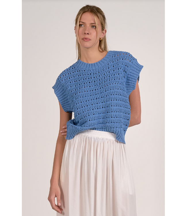 This open-knit sweater top brings the perfect blend of comfort and style. Crafted in a breathable textured knit, it features a relaxed shape with soft cap sleeves and an easy drape that pairs beautifully with skirts, denim, or shorts. Light enough for warm days but ideal for layering, it’s a go-to piece for effortless transitional dressing.