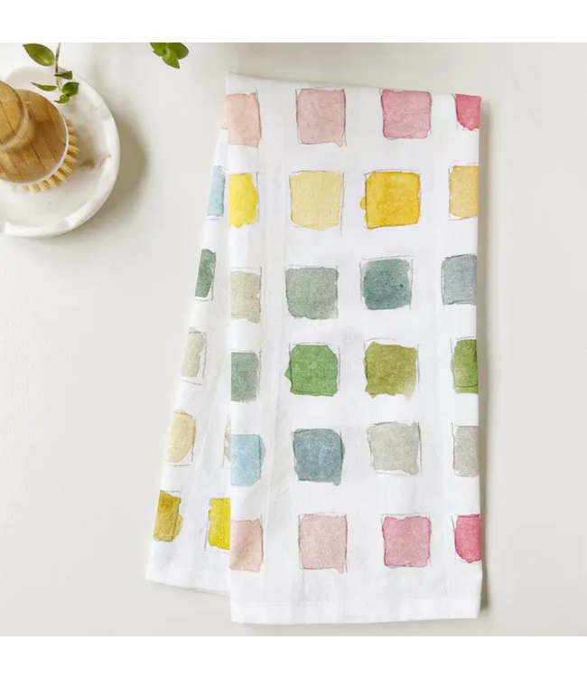 Add a touch of delight to your kitchen with this 100% cotton tea towel. Pretty watercolor paint swatches in various colors cover the towel making it perfect for washing up, lining a basket, or displaying for a cheerful dash of color.