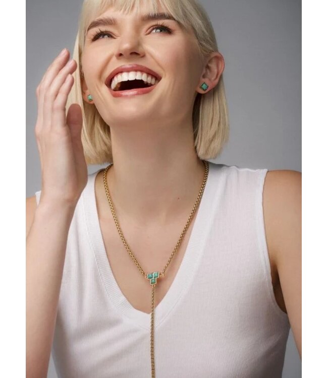 The Joni Lariat brings a modern edge to everyday styling with its clean, geometric centerpiece and fluid drop chain. Designed with versatility in mind, this piece features a reversible design—offering vibrant Kingman Turquoise on one side and luminous abalone shell on the other. Effortlessly refined, it transitions seamlessly from casual to elevated looks while adding just the right amount of movement and interest.
