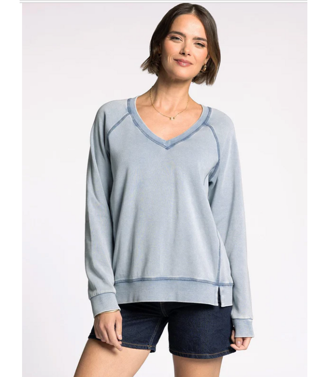 This soft blue V-neck sweatshirt is the definition of effortless comfort. Designed with a relaxed silhouette and subtle seam detailing, it offers a modern take on a classic casual staple. Easy to style with denim, shorts, or loungewear, it’s the kind of piece you’ll reach for again and again.