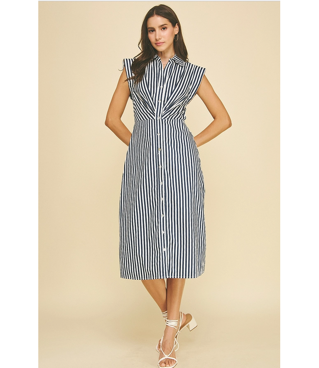 Clean lines and timeless stripes give this midi shirt dress an effortlessly polished look. The button-front design and structured cap sleeves add tailored appeal, while the softly defined waist creates a flattering silhouette without feeling restrictive.