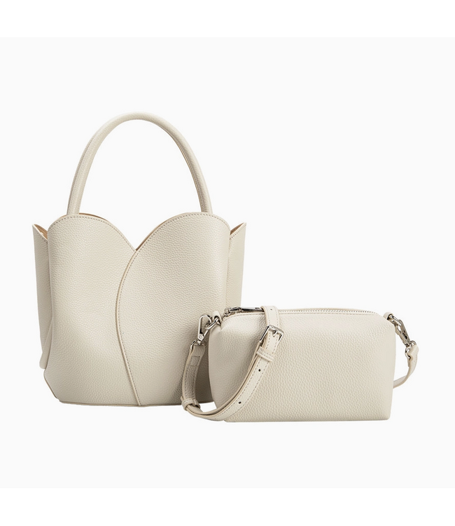 Clean, modern, and beautifully sculpted, the Melie Bianco Tulip handbag set in cream is designed to elevate your everyday style with ease. The structured tote features a softly curved, architectural silhouette that feels both refined and fashion-forward, while the matching crossbody pouch offers added versatility for lighter days. Spacious enough for your essentials yet polished enough for more elevated moments, this two-in-one set transitions seamlessly from work to weekend. Timeless with a modern edge, it’s a standout addition to any handbag collection.