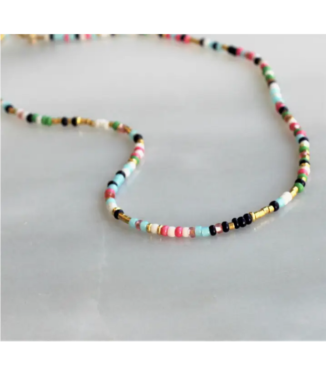 This delicate beaded necklace blends playful energy with refined design. A mix of petite beads creates visual interest and subtle movement, while gold accent details add polish and sophistication. Lightweight and easy to style, it layers beautifully with other favorites or stands alone for a relaxed statement. Designed for versatility, this necklace transitions effortlessly from casual looks to elevated styling.