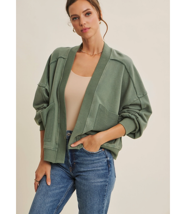 This easy knit jacket delivers laid-back polish with everyday versatility. Crafted in a soft, washed fabric, it features an open-front design, relaxed silhouette, and oversized patch pockets for a casual, wearable look. Perfect for tossing on over tanks, tees, or dresses, it works year-round as a lightweight layering essential.