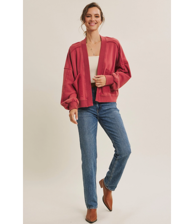 This open-front knit jacket blends comfort and style with a perfectly worn-in feel. Designed in a soft washed rose hue, it features a relaxed shape, roomy patch pockets, and an easy drape that makes layering effortless. Throw it on over tanks, tees, or dresses for a polished yet casual look you’ll reach for year-round.