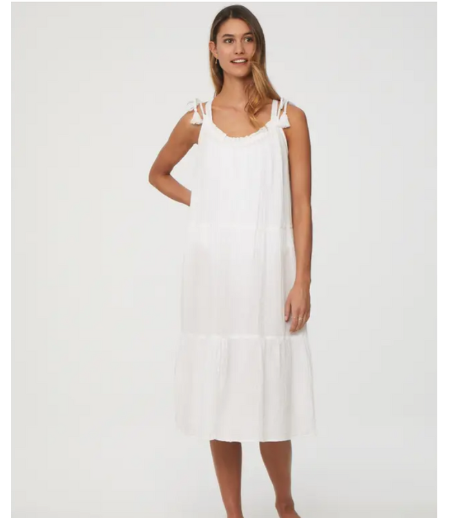 Fresh, effortless, and beautifully understated. This white midi dress features delicate tie shoulder straps and a softly gathered neckline for a romantic, feminine touch.