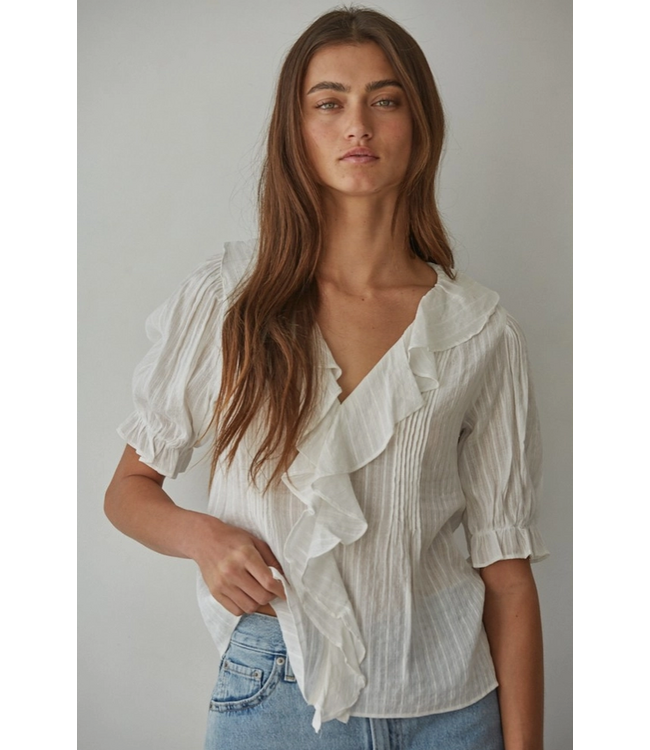 This softly textured ruffle blouse delivers an easy feminine feel with just the right amount of polish. The fluid drape and delicate ruffle detail create movement and interest while keeping the look light and wearable. It pairs effortlessly with denim for casual sophistication or dressier pieces for a more refined look.